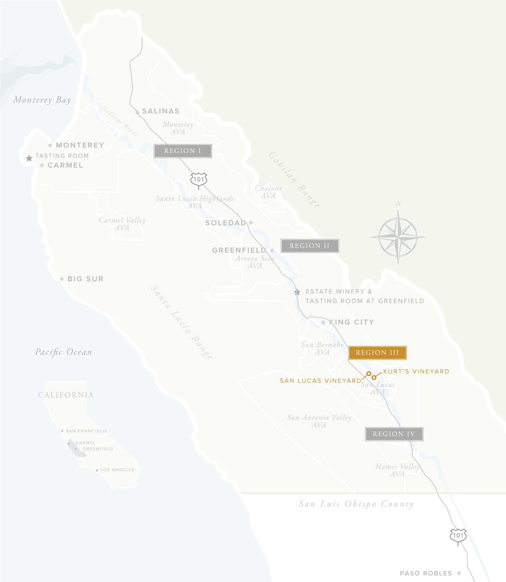Designated by our amber label, this is the San Lucas appellation, with sunny days tempered by cooling ocean breezes. Here, the days are warmer and longer, yet cool down quite dramatically when the sun goes down. Fruit-forward and softly-textured wines are the hallmark of this region, known for producing an outstanding array of varietals.
