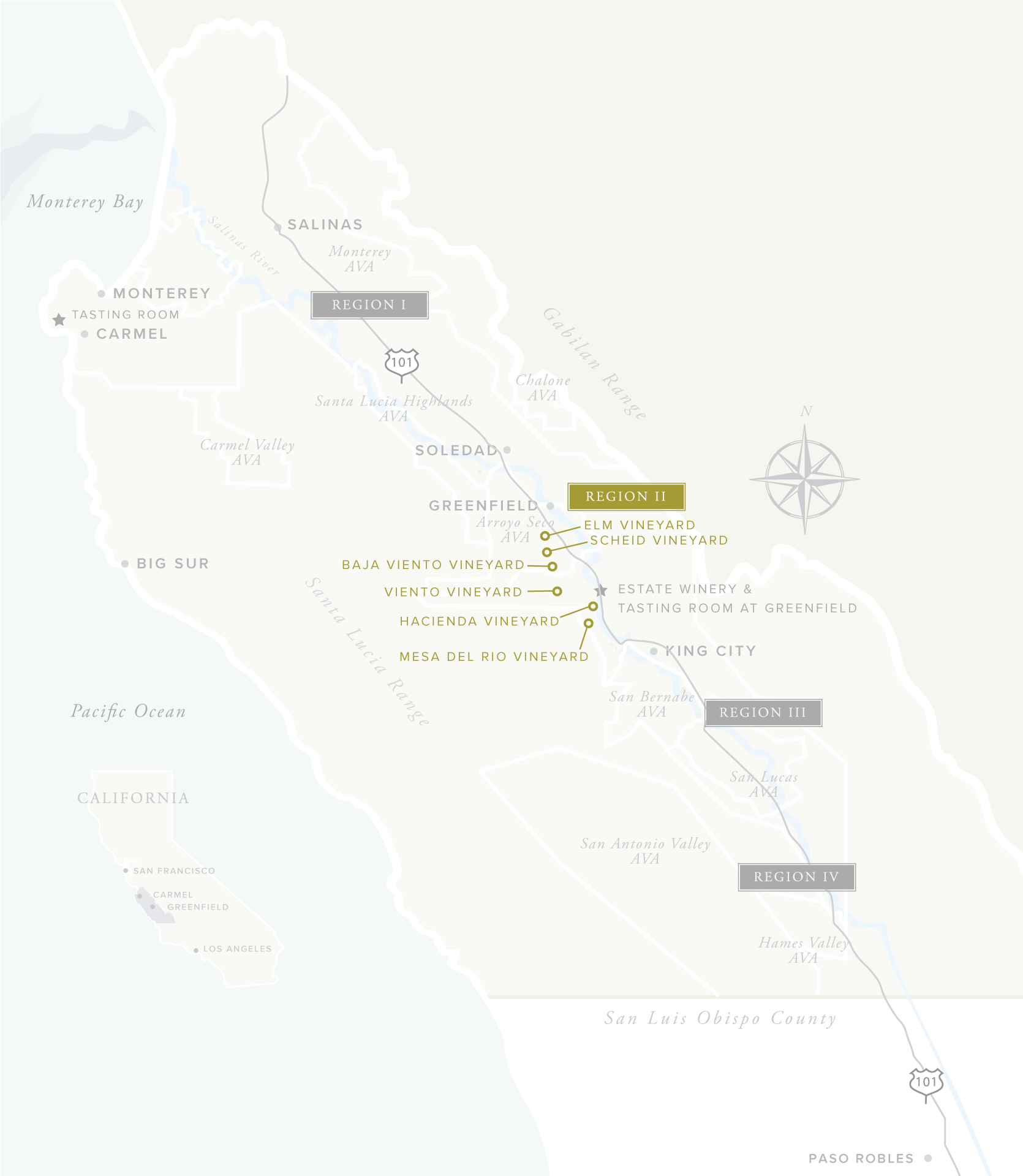 Designated by our green label, this is the Greenfield area, known for foggy mornings and cool afternoon winds. These conditions produce wines of intense varietal character and vivid aromas. The mean annual air temperature is about 60°F and evening coastal fogs in the spring and summer often linger until mid-morning the following day. The result is a longer growing season than other premium areas and wines that are typified by vibrant fruit character and balanced acidity.